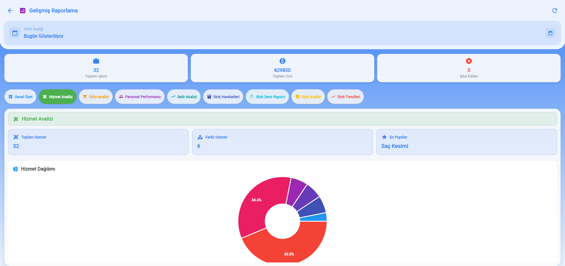 Ciro, masraflar, kasa durumu, hizmet satışları, personel performansı ve müşteri borçları gibi detaylı finansal ve operasyonel raporlar sunar. Ayrıca grafiklerle kolay anlaşılır hale getirilir.